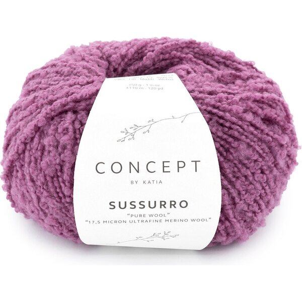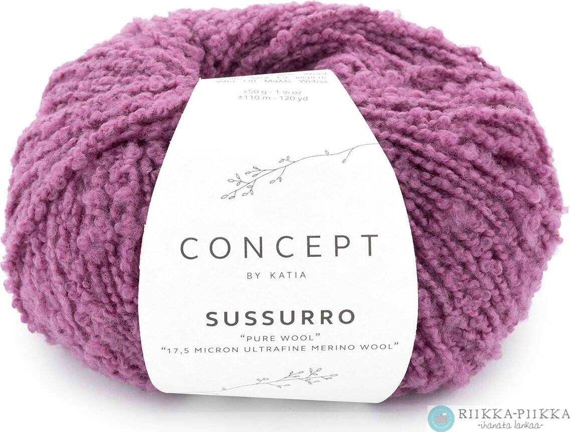 Sussurro on aivan superpehmeää villaa ja kevyttä kuin mikä! Neulepinnasta tulee jännittävä, hiukan bukleemainen pinta. Lanka sopii upeasti rentoihin, oversize-neuleisiin.