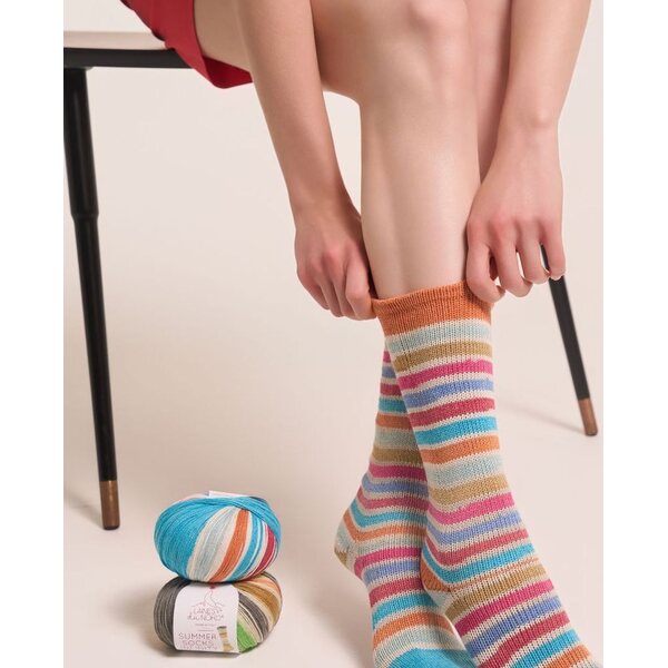 Langassa on raikas raitakuvio ja iloiset värit! Yksi kerä riittää aikuisen sukkapariin.