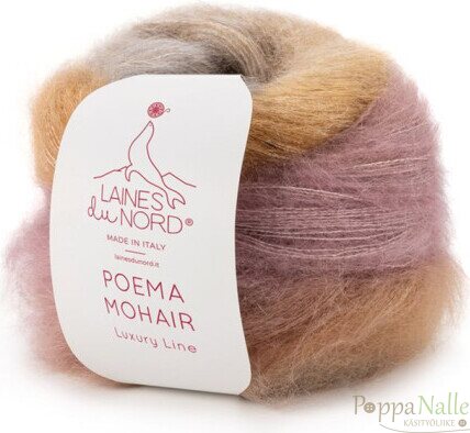 Kaunis liukuvärjätty silkkimohair, jossa yhdessä kerässä on niin paljon lankaa, että siitä teet huivin. Ja kahdesta kerästä riittää jo paitaan!